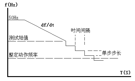 動作頻率的測試方法:測試時頻率分兩階段變化:開始以50Hz輸出,經(jīng)過變化前延時后,先按所設(shè)定的df/dt均勻下滑(或上滑)至測試始值頻率,然后按設(shè)定的步長以一定時間間隔逐格降低(或上升)頻率,在該過程中如保護動作,則測出動作值。如未動作,當(dāng)變化至測試終值,即認(rèn)為保護不會動作而結(jié)束該項目測試。