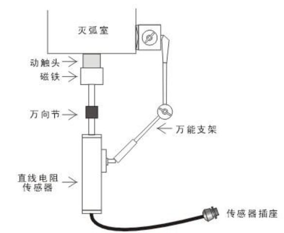 200mm、300mm用于SF6開關(guān)行程,速度的測量,此兩種傳感器為非標(biāo)準(zhǔn)配置。以某型號真空開關(guān)為例,如下圖。直線電阻傳感器在安裝時(shí),要保證傳感器運(yùn)動軸能夠直線運(yùn)動,用磁性萬能支架固定好傳感器。對于SF6開關(guān)、油開關(guān),方法類似。