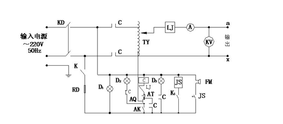 其中JS:時(shí)間繼電器 TY:自藕調(diào)壓器 FM:報(bào)警器 LJ:過流繼電器 D1、D2、D3:指示燈 C:交流接觸器 RD:熔斷器 K:總電源開關(guān) K1:時(shí)間繼電器電源開關(guān) AK:調(diào)壓器回零限位開關(guān) AQ:起動(dòng)按鈕 CL:高壓硅堆 AT:停止按鈕 A:輸出電流表 KV:輸出電壓表